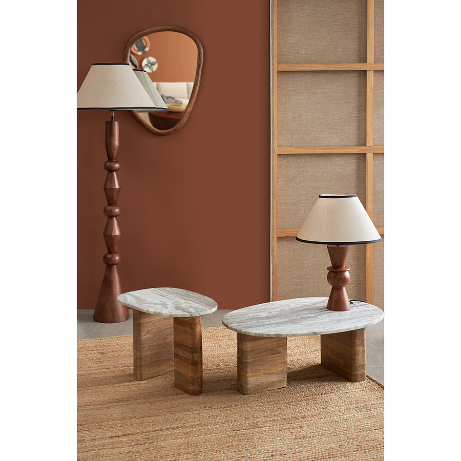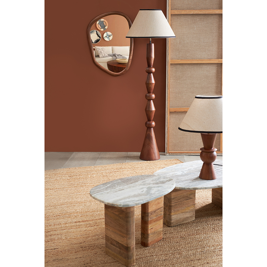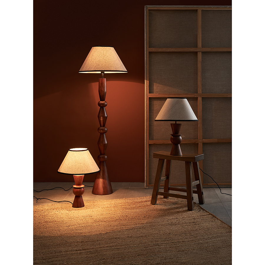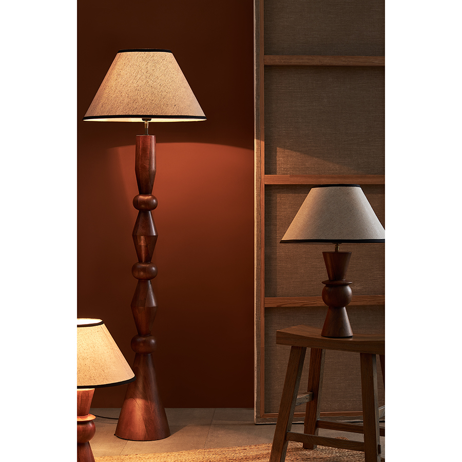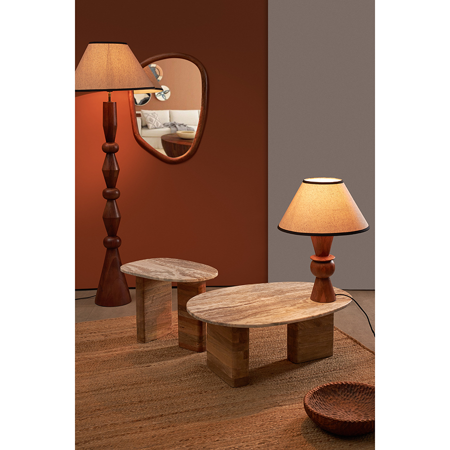 - Основание светильника изготовлено из мангового дерева, известного своей прочностью и выразительной текстурой. Его резная форма подчеркивает природную красоту материала, делая дизайн еще более привлекательным.