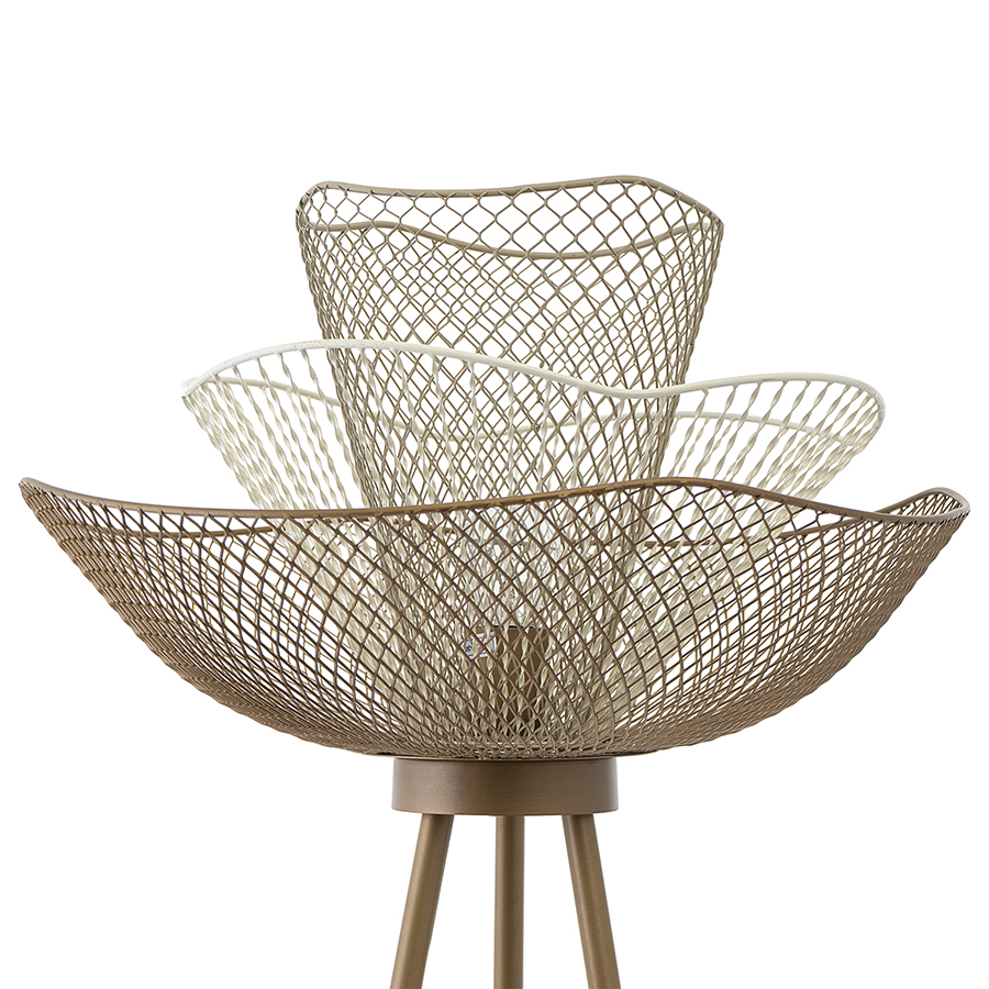 Материал: железо. Размеры: 53х53х153 см. Цвет: белый/бежевый/золотой. Тип цоколя: Е27. Степень пылевлагозащиты: IP20. Максимальная мощность ламп: 25 Вт. Напряжение: 220-240 В. Длина провода: 3,5 м. Переключатель: ножной. Площадь освещения: 1,7 кв.м. Лампы в комплекте: нет.